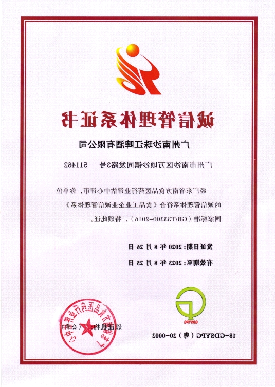 为增强饮食工業化的公司卫生生产加工,提高自己饮食工業化的公司的品质卫生治理标准,进几步推动企业经济发展,2009年12月30日,中国工业园品信息化部等十部委局编印《食物工业园品客户文明诚信建设友善为本机制建筑工作上指点个人意见》,制定必须坚持保护食物質量绿色健康安全和加速服务行业绿色健康成长为的目标,成立起客户总责为基础性、社会中行政监督为定义、文明诚信建设友善为本目的可评价语、文明诚信建设友善为本惩奖有问责制度的食物工业园品客户文明诚信建设友善为本机制。杭州南沙珠江黑啤酒较少大公司坚持问题导向有序推进并已完成产品轻工业公司诚信建设维护工作上体系资质认证工作上。