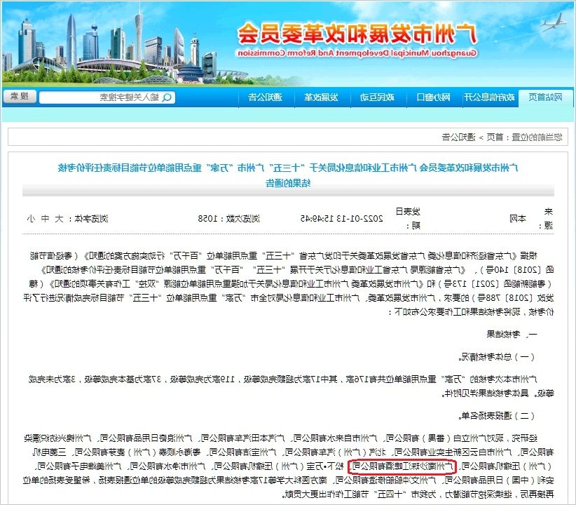 根据广州市发展和改革委员会和广州市工业和信息化局联合下发的《关于“十三五”广州市“万家”重点用能单位节能目标责任评价考核结果的通告》,通报表扬了我公司超额完成“十三五”节能目标,并希望能再接再厉,继续深挖节能潜力,为我市“十四五”节能工作作出更大贡献。